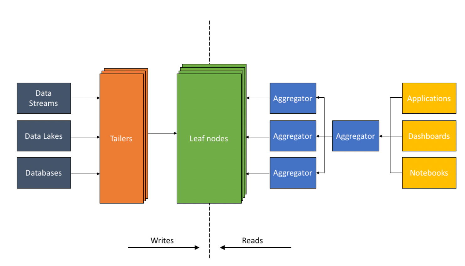 Aggregator: The Aggregator tier is designed to deliver low-latency aggregations, be it columnar aggregations, joins, relevance sorting, or grouping.