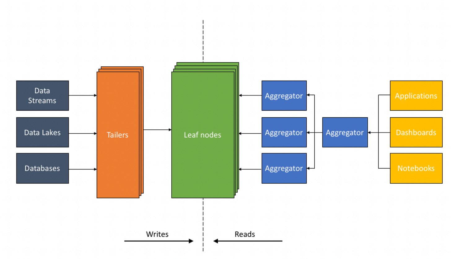 In Aggregator Leaf Tailer architecture Tailers fetch new data from data sources, Leaves index and store the data and Aggregators execute queries in distributed fashion.Keeping compute resources separate between ingestion and queries, and allowing each to be scaled independently.The system can scales Tailers when there is more data to ingest and scales Aggregators when the number or complexity of queries increases. As a result, the system provides consistent query latencies even under periods of high ingestion loads.
